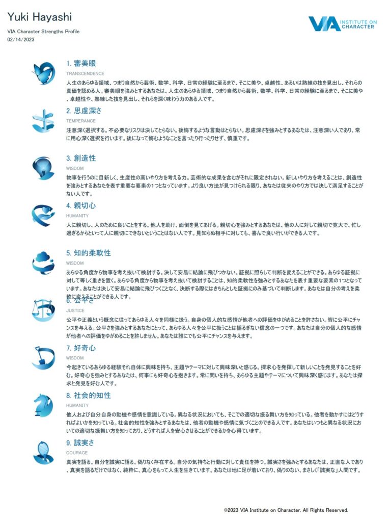 VIA強み診断テスト(https://www.viacharacter.org/Survey/Account/Register)は、「最高の自分を語る共通言語を見出す」ことを目的に、ポジティブ心理学のセリグマン教授に声がけされ、メイヤーソン財団からの支援を得て開発されたもので、簡単に言えば、その人の「人格的な強みのリスト」を知るためツールです。